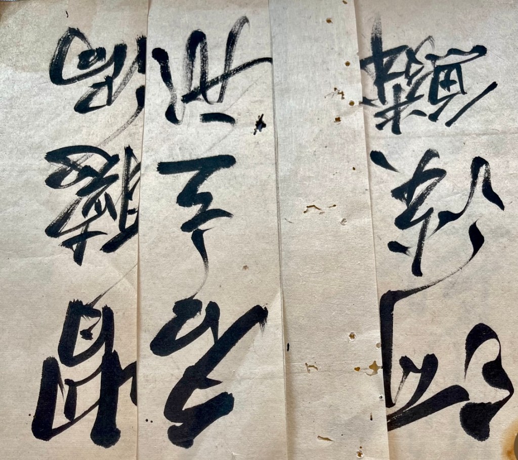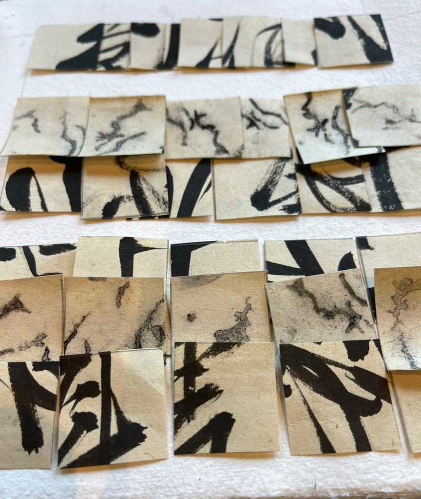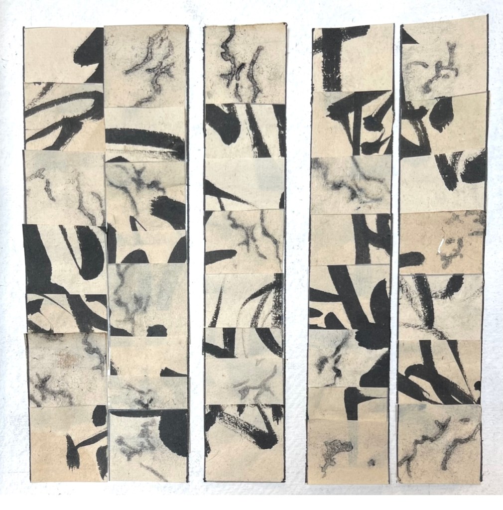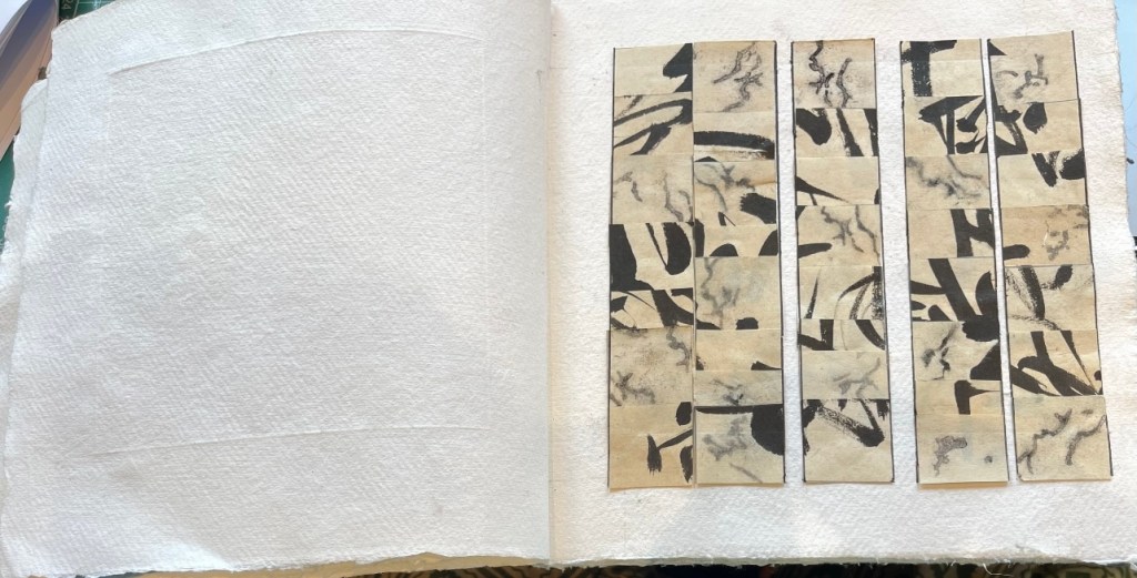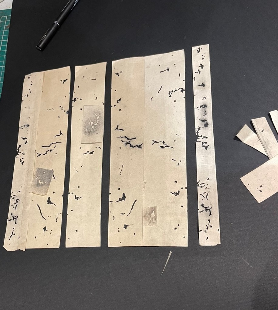 The work was informed by found material – I came upon some very old notebooks filled with inked Chinese characters drawn down every page of approx that was approximately a third the size of an A4 page. The beauty of the books ( possibly old school notebooks ) was enhanced by the abundance of book worm holes and markings that were crated by these little insects down each side of the pages. They were almost lace-like in design with an uninhibited and otherworldly sense about them. Surviving on the tiny fragments of paper nutrients they consumed, carelessly devouring the books in pursuit of their survival. Our human traces and importance lost upon them in their microscopic entomological world.