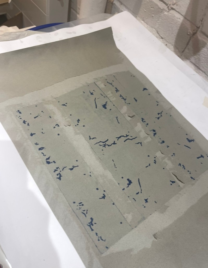 The tiny dark blue images appearing on the paper – I choose to use a neutral coloured papers for this work wanting to avoid the harshness of a bleached white allowing for a more naturel canvas.