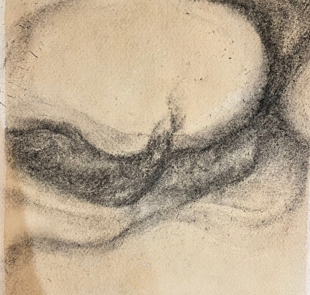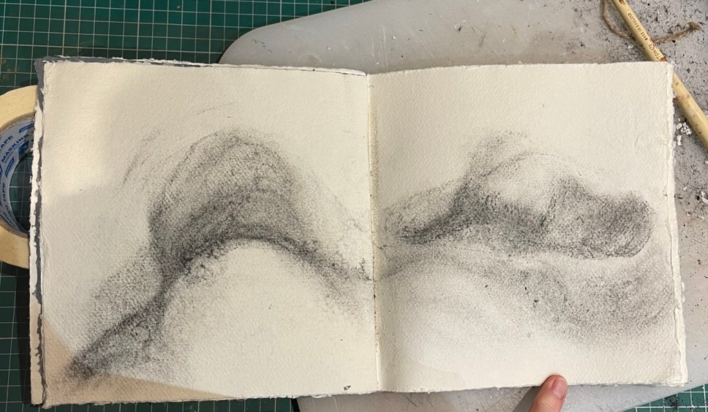 Working on these images in my sketch book have been so immersive – moving, erasing and spreading the charcoal across the pages create a sense of movement and changing form… Looking at this in 3D format perhaps.. larger scale ….???