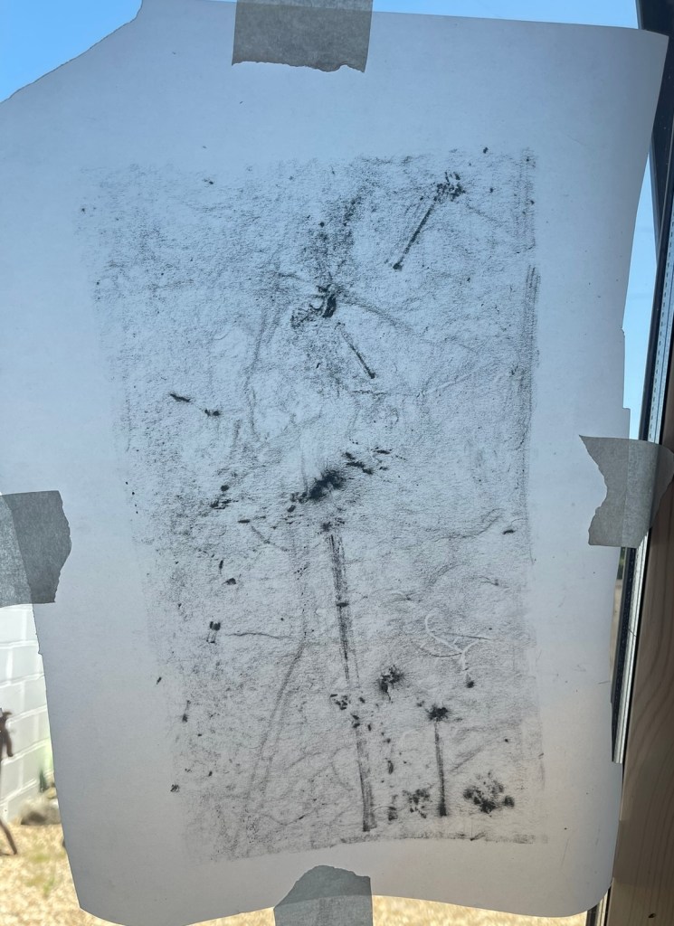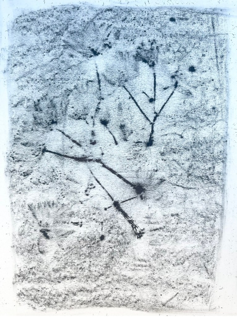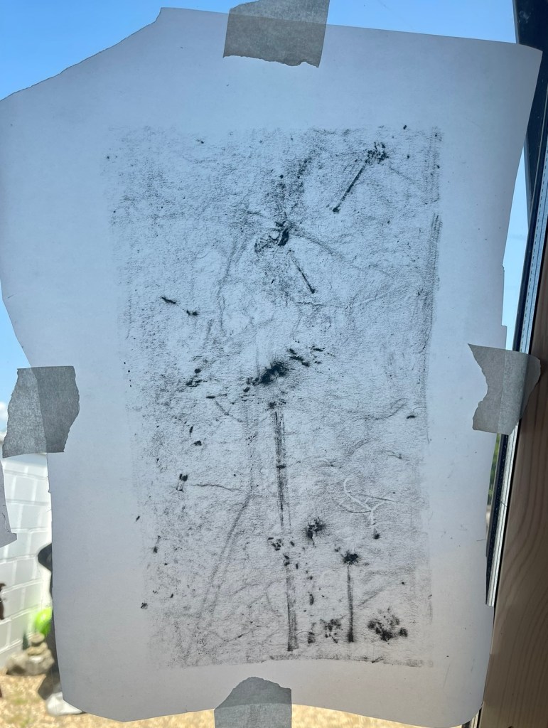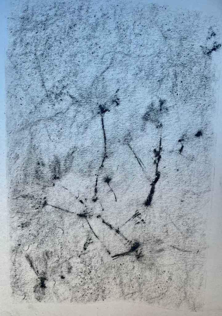 the soft medium of charcoal was ideal for the moving swirling murmuration, I studies videos and photographs to capture this mass – I felt it had Harry Potter “dementor ‘ qualities to it as it hung so dark and foreboding n the sky swooping low and stealth like as if it woul d swallow up anything in its path. It resonated so much with the feeling of fear and worry, anxiety, depression etc and yet at the same time is a thing of beauty to behold and hear.