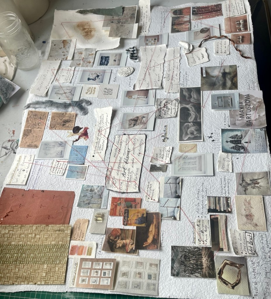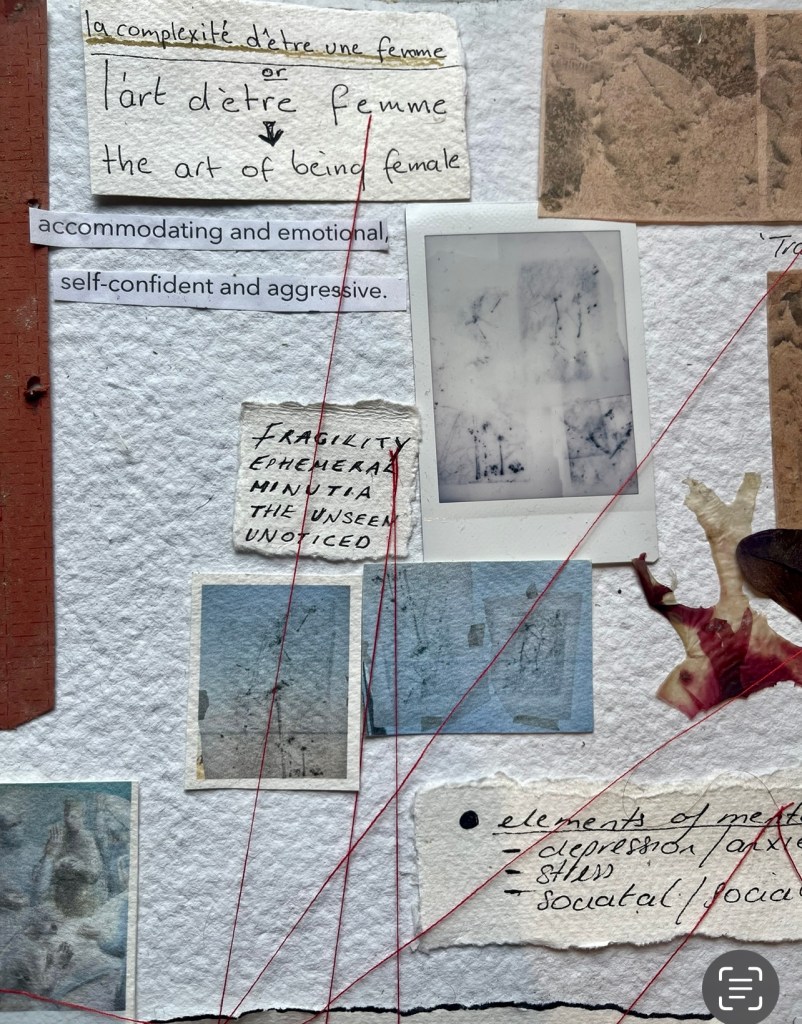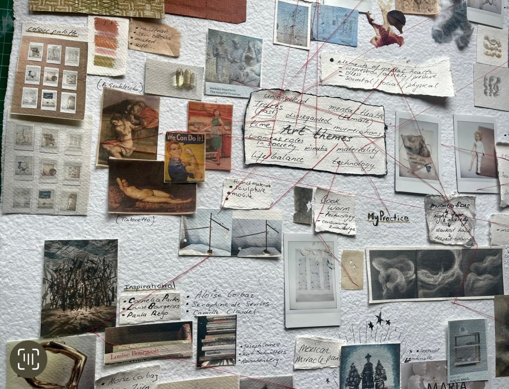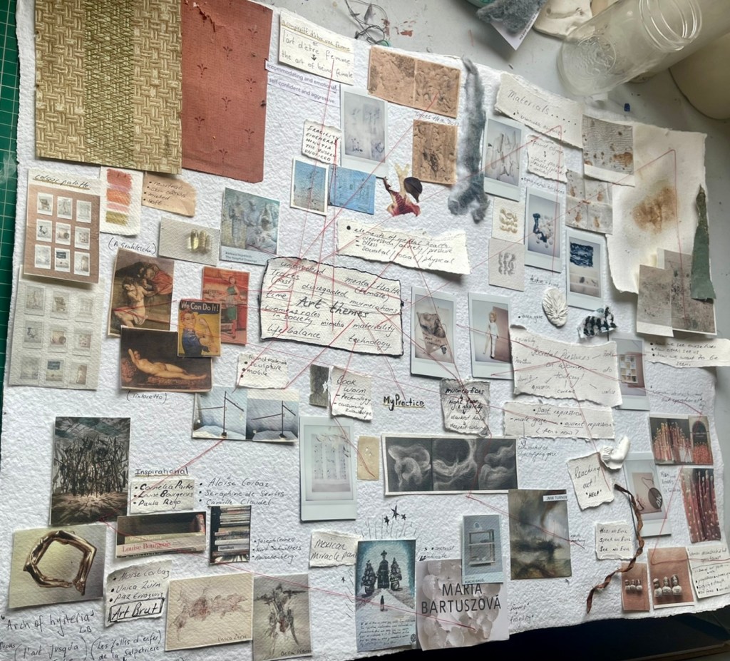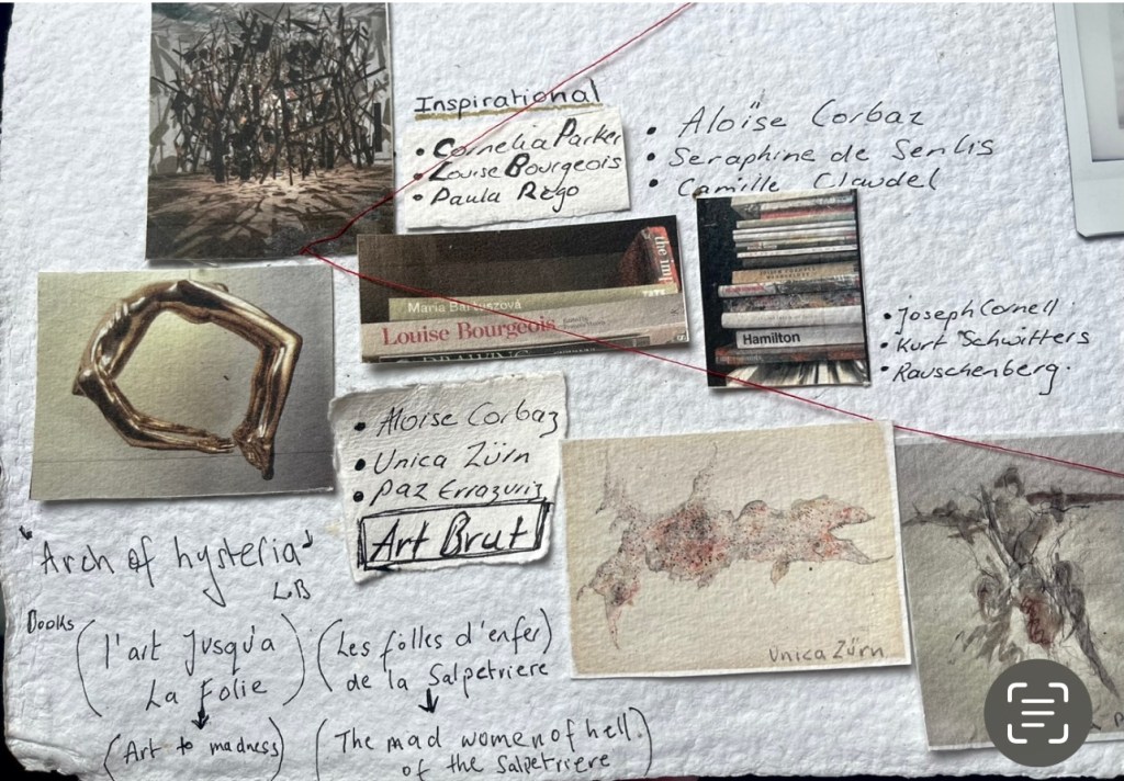 I have combined photography of past work, themes, inspiration materials. colour ideas and other information to help inform my practice. The mapping seems to have culminated in a potential project I have called ” la complexie de’etre femme’ or the ‘Complexities of being female’ The French influence has come from my research surrounding the La Salpetriere and the female artists held in that asylum and others like it. Its emerging to be a multi-piece project focussing in on the issues women face today and the evolving societal pressures upon us to be ‘everything all at once ‘. This potential line of interest is still in embryonic stages and still has he potential to diversify….