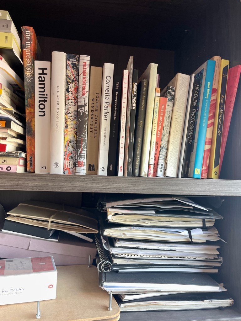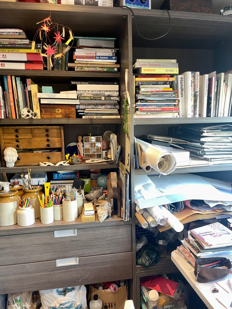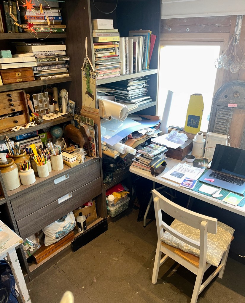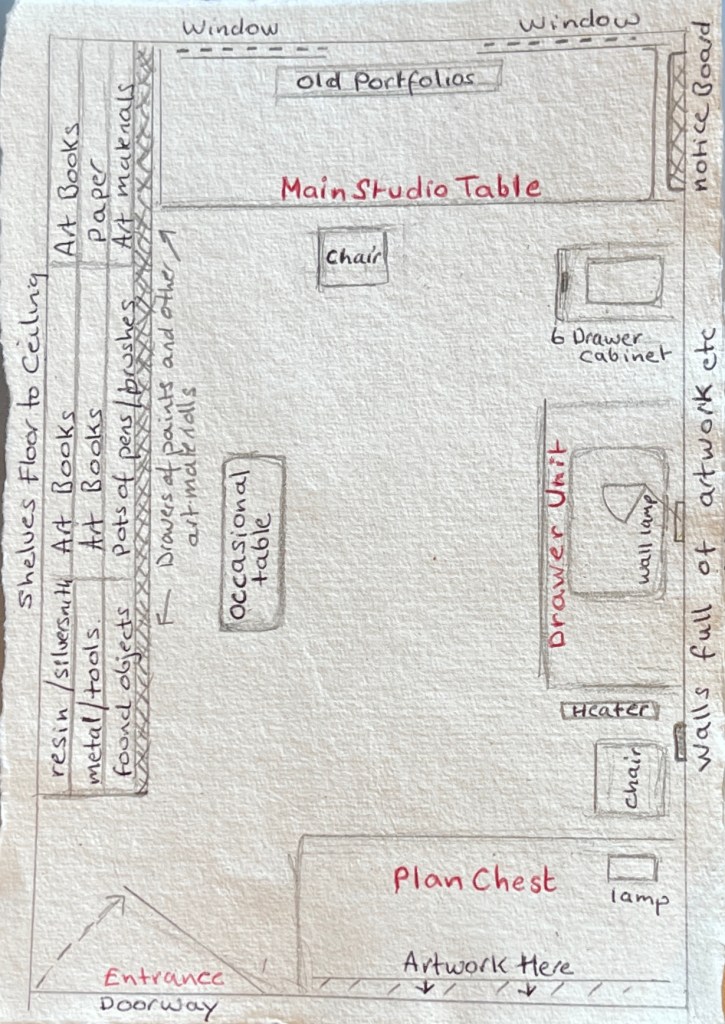 The studio space is s filled with floor to ceiling shelves to my right as I stare out onto the front garden – an occasional pet rabbit hops by. On my left is a smaller work top on top of a mini modern plan chest full of research material and art props and past work.