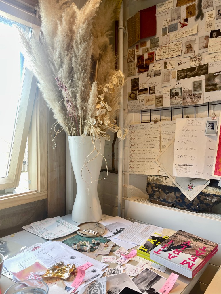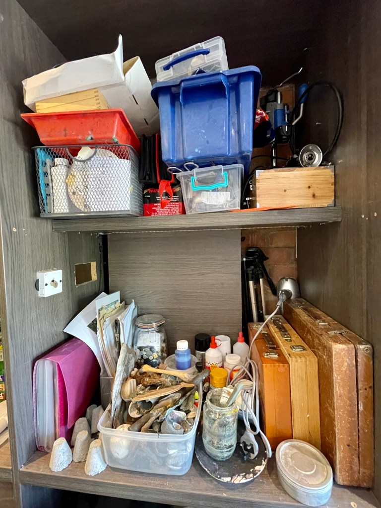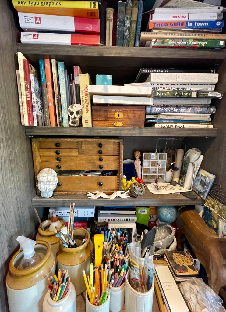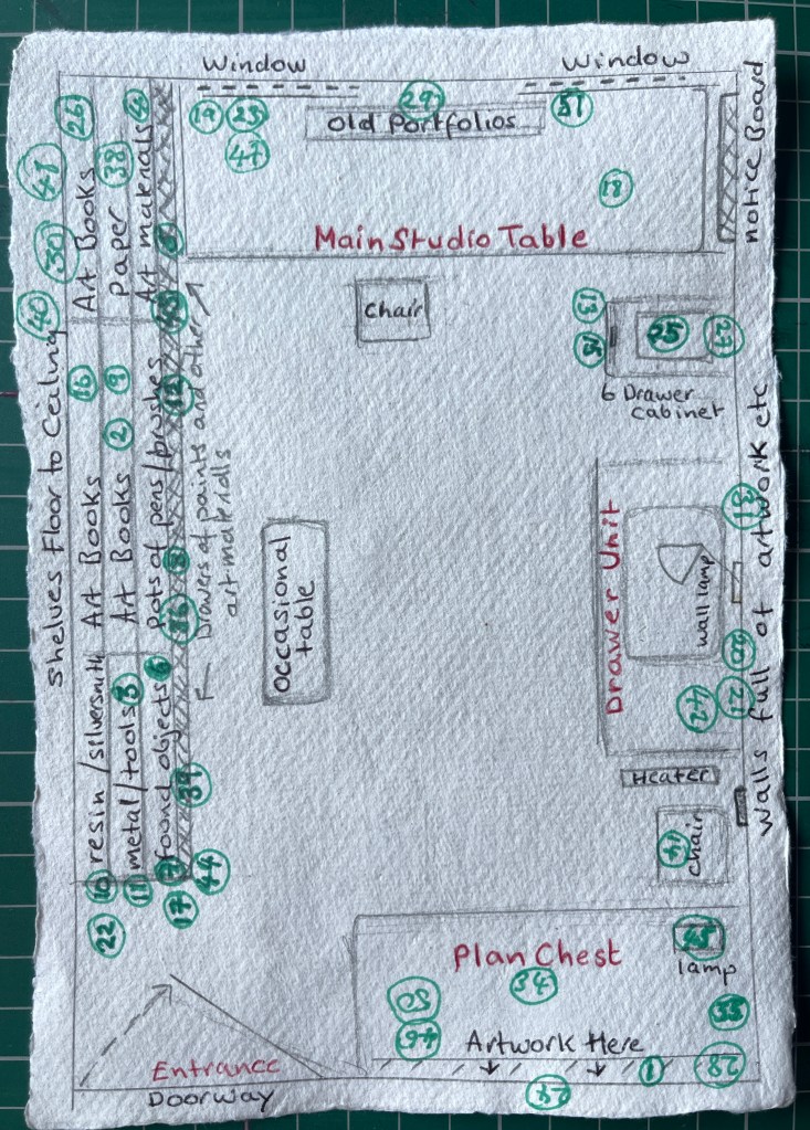 The studio space is s filled with floor to ceiling shelves to my right as I stare out onto the front garden – an occasional pet rabbit hops by. On my left is a smaller work top on top of a mini modern plan chest full of research material and art props and past work.
