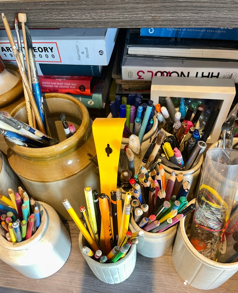- Rainbow of pencils, brushes, and mark-making tools in vintage clay jars – ten