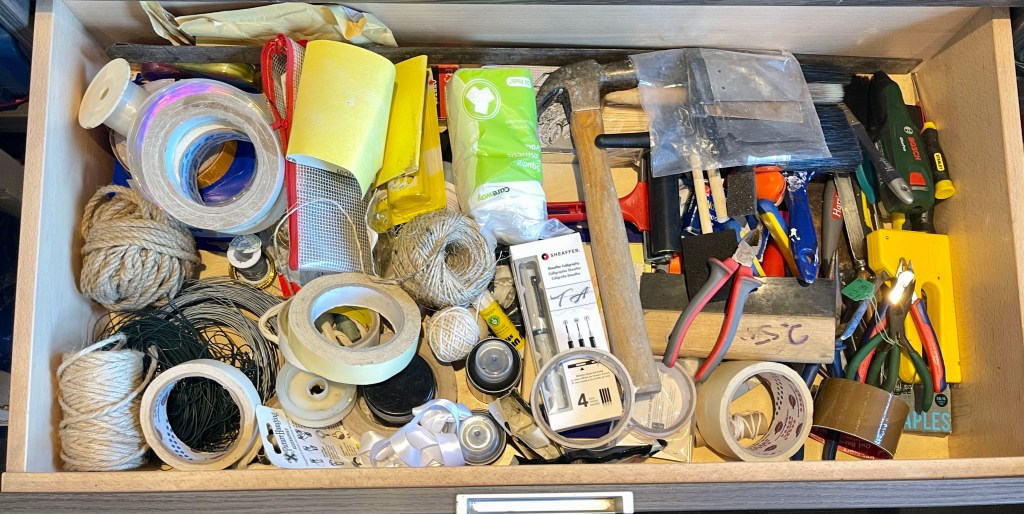 Underneath my long trestle table are portfolios also filled with past work and a small multi – drawer tin cabinet. The top drawer of this is most important and contains a bar or two of very dark organic chocolate that anchors me here and helps me get through tired sticky, moments in artistic production.