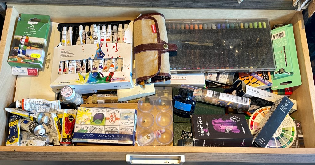 I have rearranged in here a few times, my latest addition was a much coveted plan chest. Its actually too big and I have lost some valuable working top space – but I love its warmth and history and ts beautiful patina. It makes the studio feel like a real artists studio. I use it for all my past works. On top is a collection of art I have produced, some I have bought and some are my sons from his “A’ level artwork, his gorgeous portrait of my mum takes centre stage.