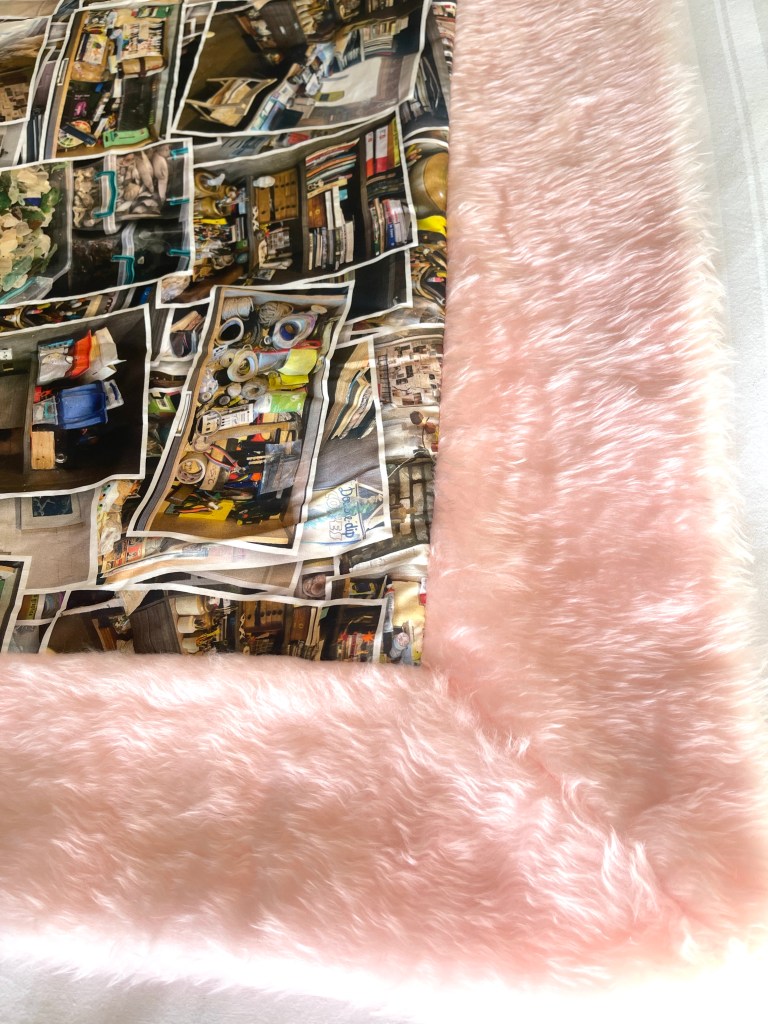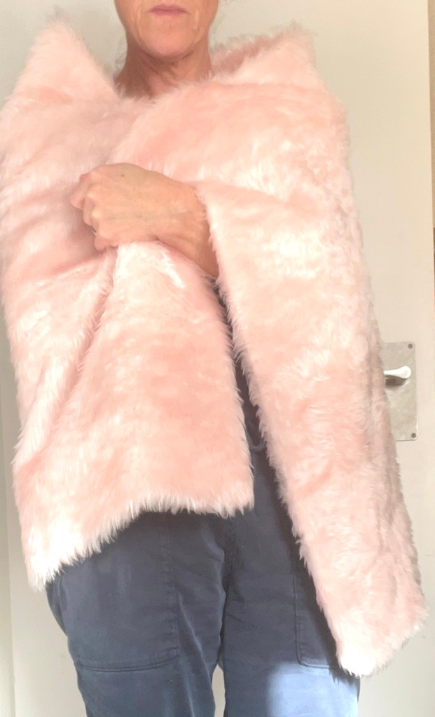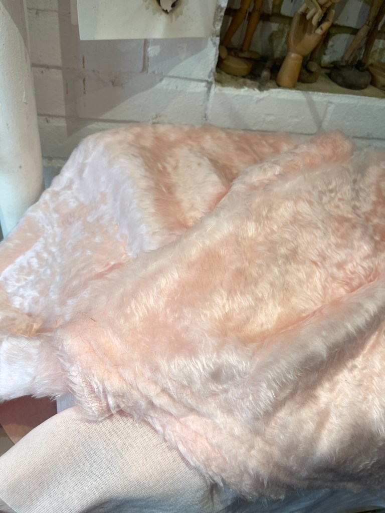 The material was jsut over a metre long and 0.5 metre wide. It was quite a thin unappealing texture so to create the sense of cocooning and warmth that I wanted to associate with my work space I order some skin pink fur to attach to the back of this to create a cosy wrap / blanket.