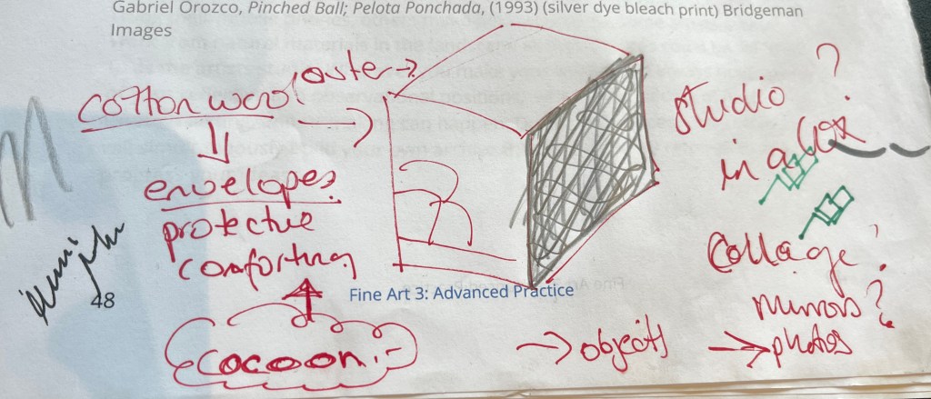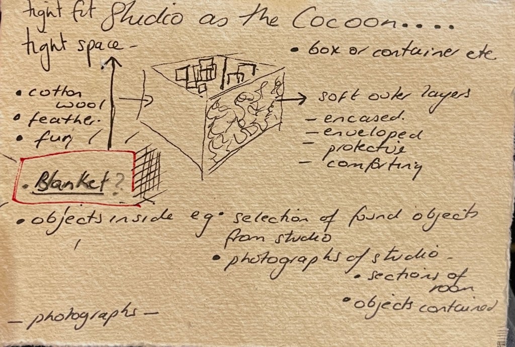 The cocoon like feel I have of my studio space was prevalent t me in this exercise and I came up with a number of concepts to represent this;