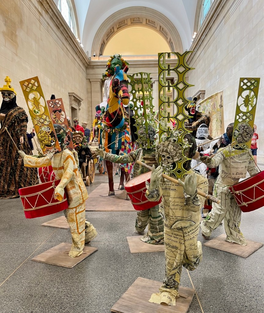 ‘what I try to do in my work is mix ideas of attraction and ideas of discomfort – colourful and attractive, but strangely scarily surreal at the same time’ Hew Locke 2022.
