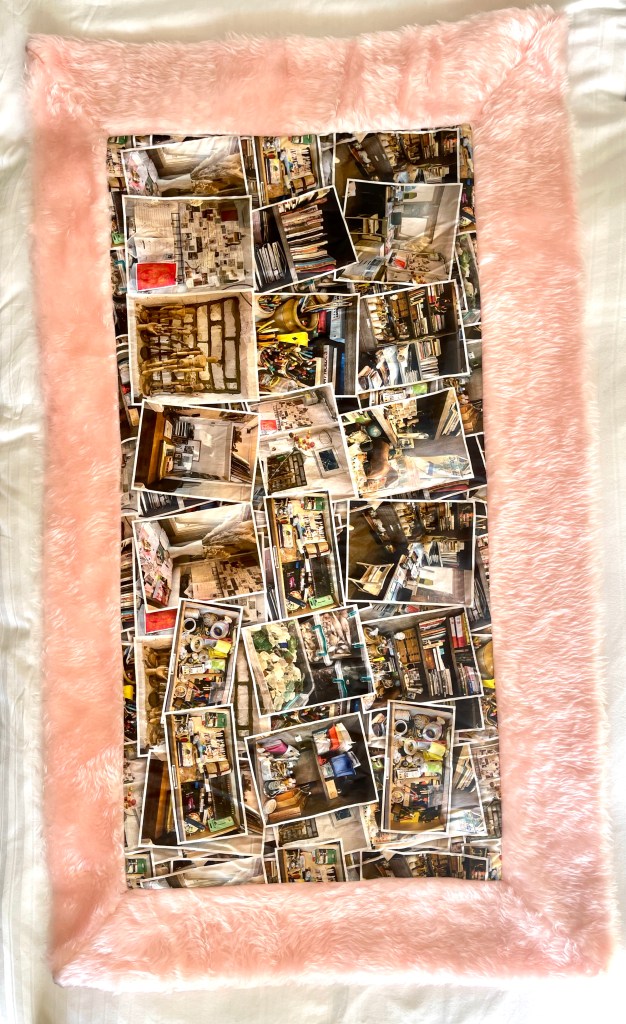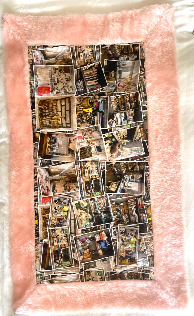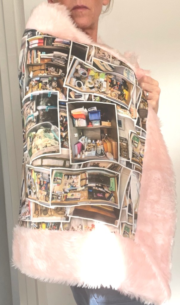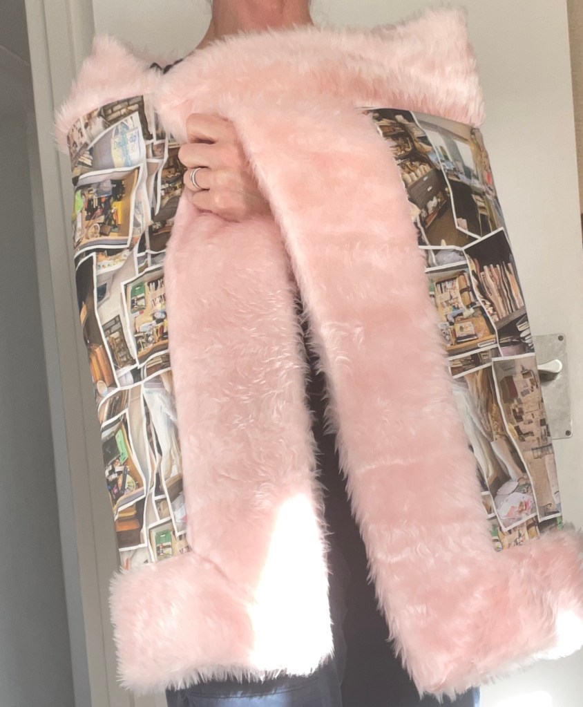 Wearing this work I hope a person would feel a sense of warmth, comfort and some joy, (maybe smiling at wearing a fluffy pink fur stole !) I would like the wearer to have a glimpse into some of the emotions I might feel when working in my studio. Visually they could also explore the intimate space and the cramped conditions of my creative environment viewing the collection of pictures on the inside of the piece. It is an interactive piece that I will leave in my chilly studio for visitors to wear should they wish.