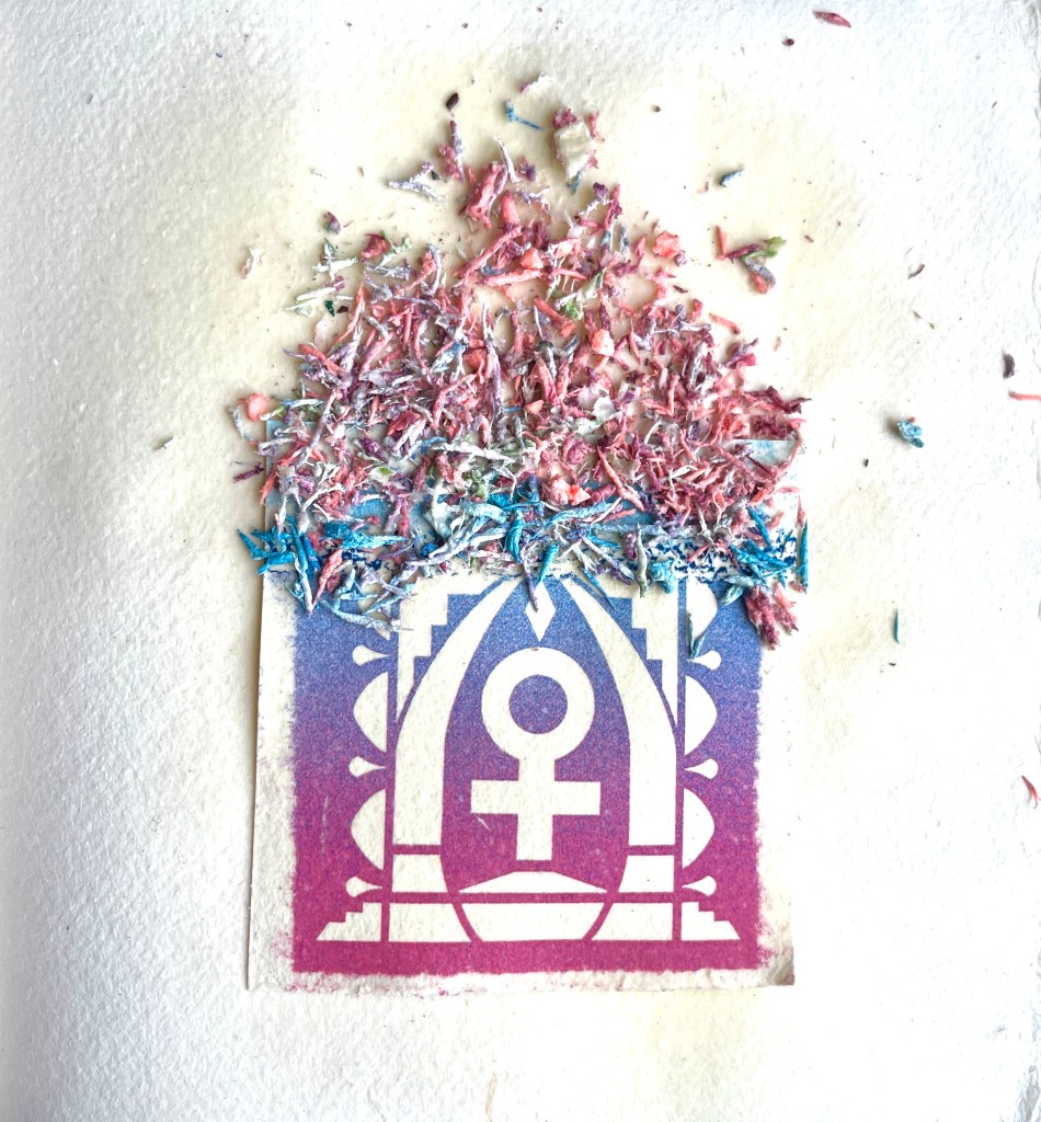 Picking out a piece of paper from the rubbish I remembered I had wrapped up a mass of erasure pieces, the remnants produced from some active rubbing-out. I took these colourful pieces and arranged them over the top of my work on ‘Shrine to Female’ This image now appears on the one hand to be morphing, disconnecting and breaking down. Looked at another way it can be seen as the process of the creation of the image. Like a mass of pixels coming together to form the image below them. The narrative has expanded from a semiotic image to one of open question and origin…..